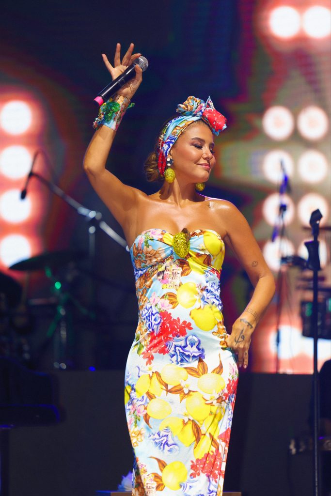 Gülben Ergen’in sahnedeki ışıltısını tamamlayan, altın sırmalarla dokunmuş göz alıcı kostümü Raisa Vanessa imzası taşıyordu.